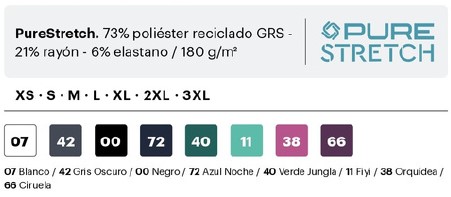 PureStretch. 73% poliéster reciclado, 21% rayón, 6% elastano / 180 g/m2